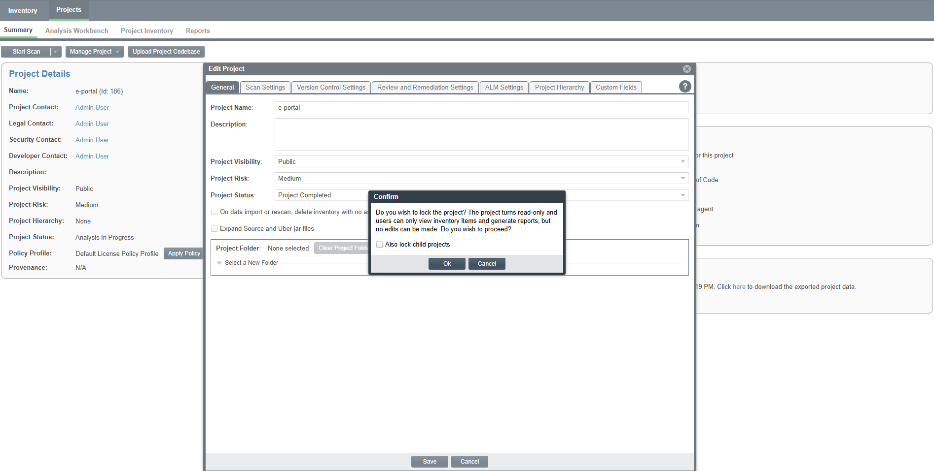 Additionally, Code Insight also allows you to unlock the same project—and its associated child projects, if applicable. To unlock a project, change the Project Completed status to a different required status for the Project Status field in the General tab on the Edit Project window. This action also displays the Confirm dialog box, which allows you to confirm the unlocking action and to optionally include the associated child projects in the unlocking process. Selecting the check box labeled Also unlock child projects in this dialog box allows you to unlock all associated child projects along with the parent project.